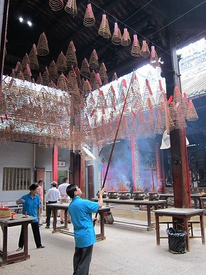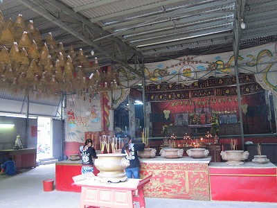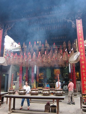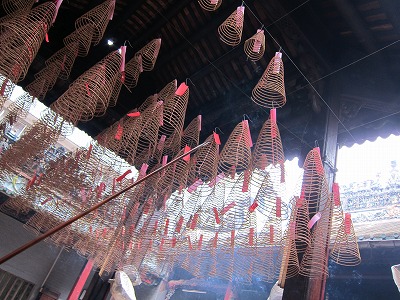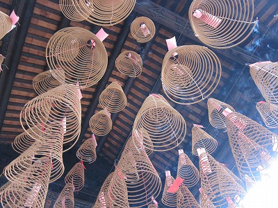 右上には一ヶ月はかかるという巨大ならせん型渦巻き線香がある。